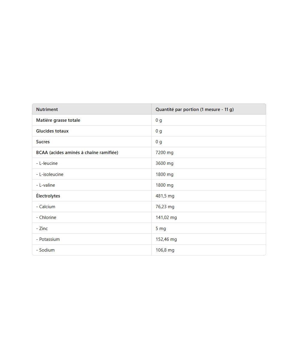 En plus des BCAA, la formule contient des électrolytes essentiels pour l’hydratation pendant l’exercice :
