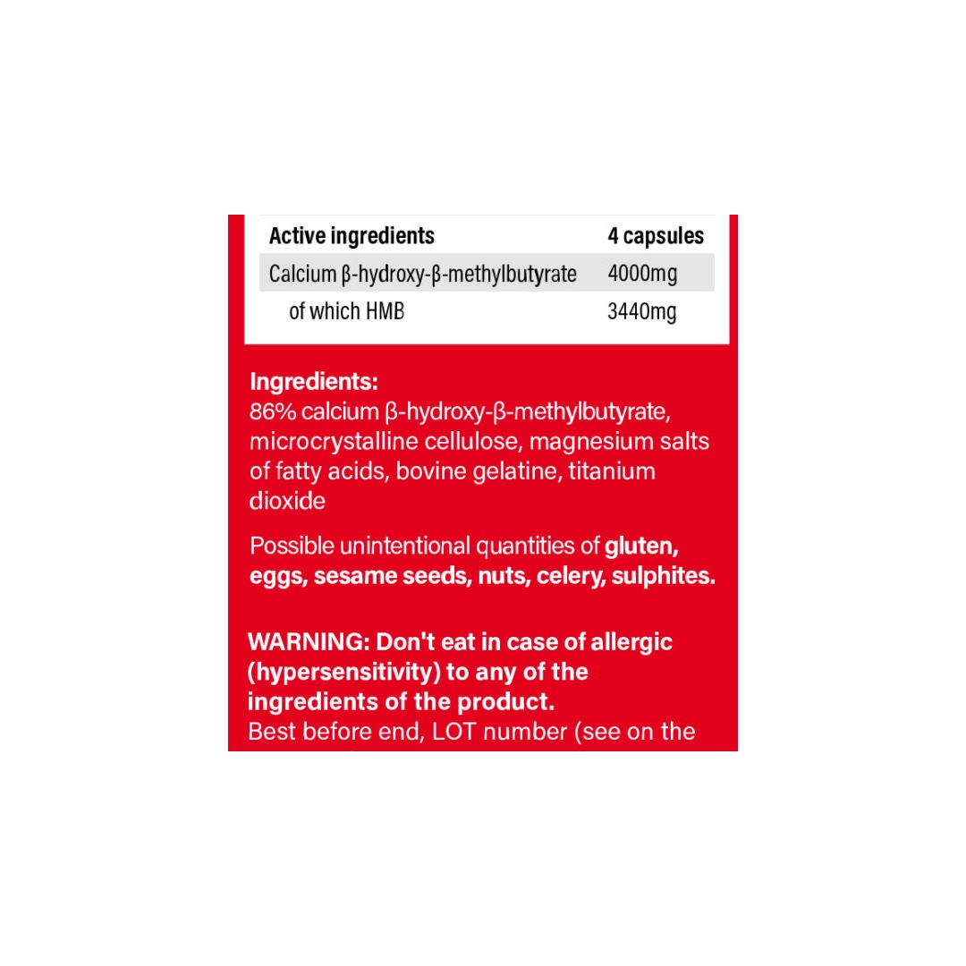 le bêta-hydroxy-bêta-méthylbutyrate de calcium (86%), la cellulose microcristalline, les sels de magnésium d’acides gras, le dioxyde de titane et la gélatine bovine.