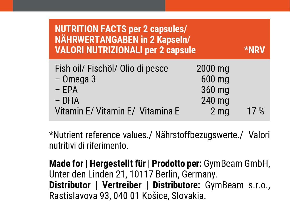 Omega 3 GymBeam 120 capsules fournit une dose élevée d’acides gras essentiels EPA et DHA, essentiels pour la santé cardiovasculaire, la fonction cérébrale et la réduction des inflammations. Idéal pour les personnes souhaitant soutenir leur bien-être général avec un produit de haute qualité et pureté garantie.