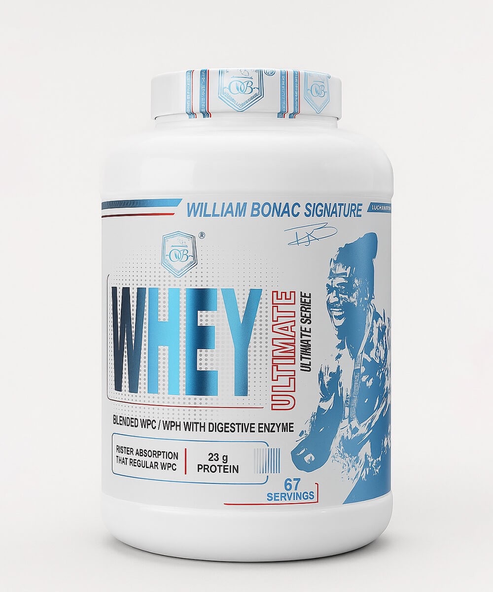 Whey Ultimate William Bonac Signature est une protéine en poudre haut de gamme conçue pour les athlètes exigeants et les pratiquants réguliers de musculation. Sa formule associe whey concentrée et whey hydrolysée, offrant ainsi une double vitesse d’absorption : rapide après l’entraînement et prolongée dans le temps pour un effet anti-catabolique.
